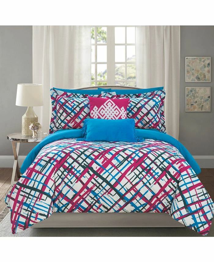 - Contemporary design featuring an abstract pattern print on the face with a solid blue backing – Design and color coordinated reversible pillow shams and decorative pillows complete the look