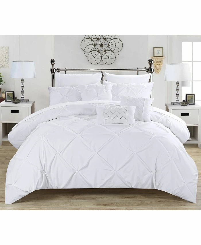 A fashion forward bed in a bag comforter set with everything you need for a complete bedroom décor makeover. Elegant and sophisticated pinch pleat pin tuck design with ruffled details. Super-soft microfiber sheets, design coordinated shams and deco pillows are included to complete the look.