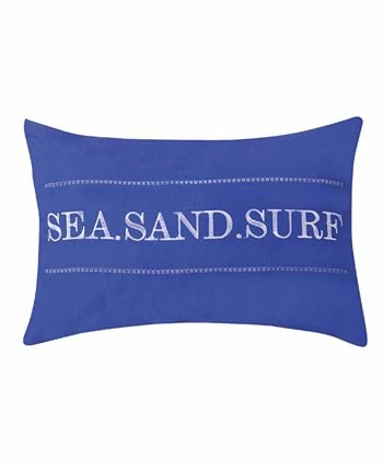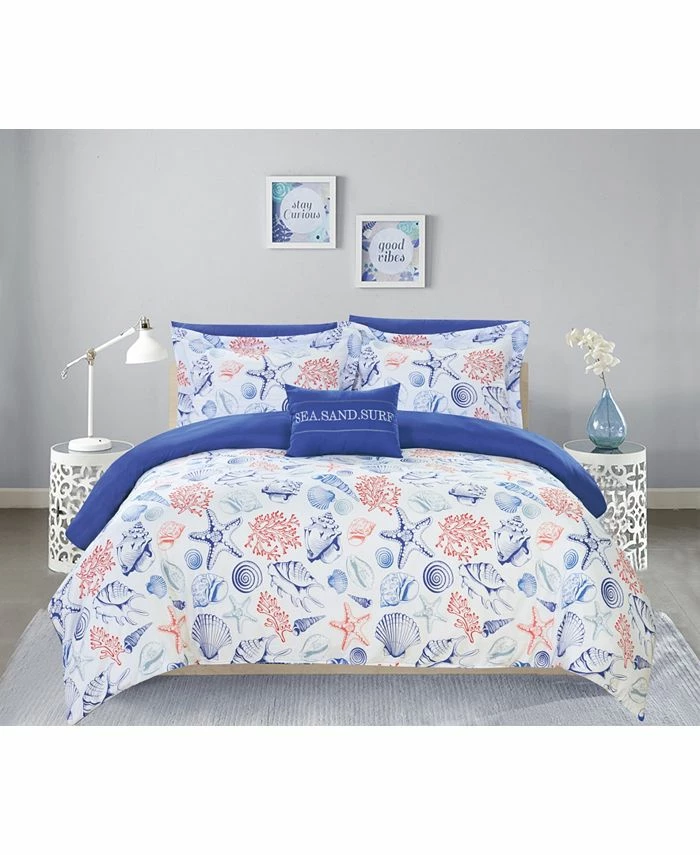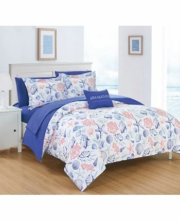 A modern comforter set with everything you need to give your bedroom a bold, fresh look. The comforter features a printed Sea, Sand, Surf theme on the face featuring starfish, conches and shells on a sandy white field with a solid blue backing on the reverse. Design coordinated super-soft microfiber sheets, pillowcases, reversible pillow shams and an embroidered Sea.Sand.Surf decorative pillow are included to complete the look.