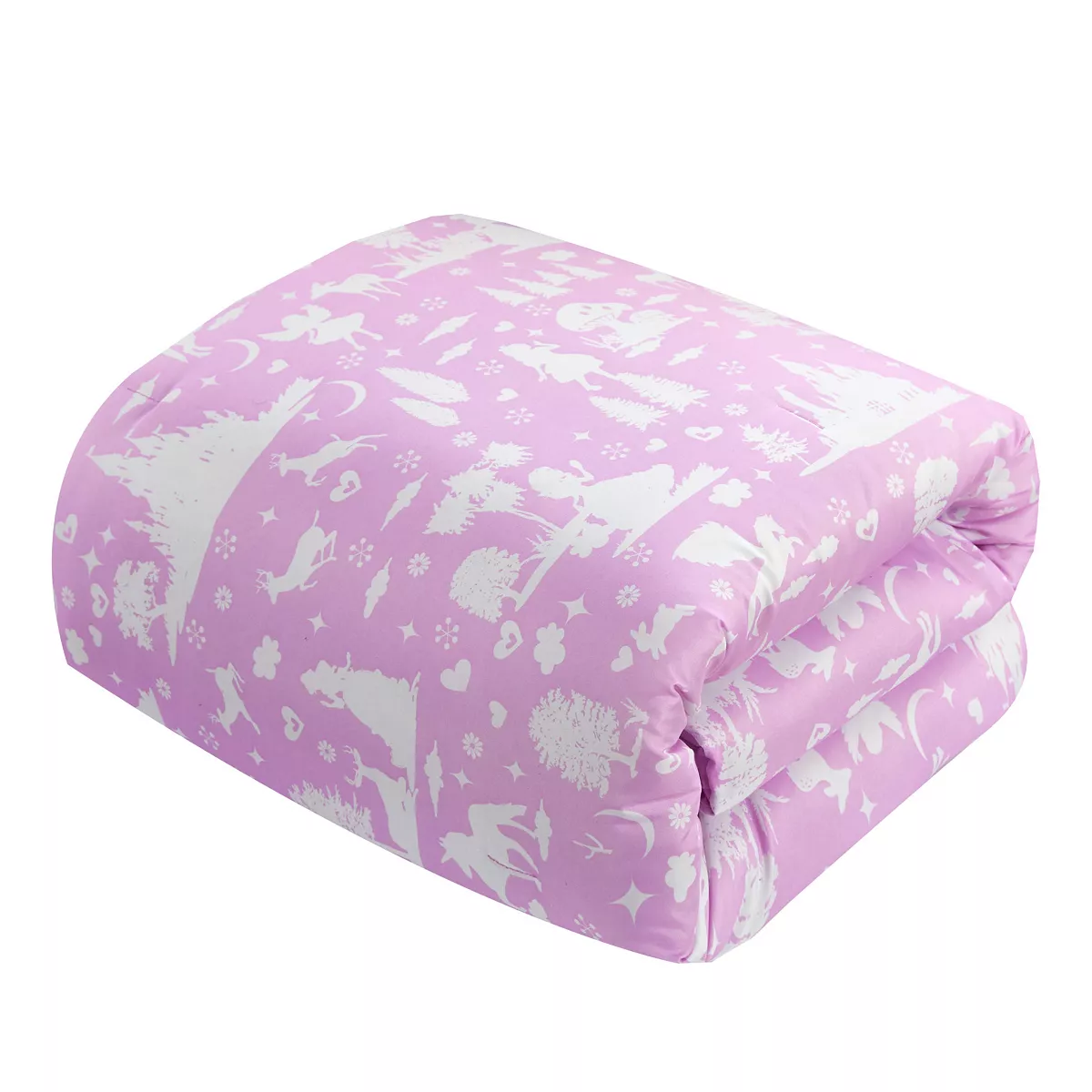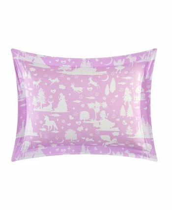 A magical comforter set perfect for back to school with everything you need to a transform a kid’s or young adult’s bedroom. The comforter features a two-tone Fantasy Forest fairy tale theme print design complete with princesses, unicorns and a field full of magical details. Design coordinated pillow shams, a heart shaped decorative throw pillow and a fleece throw blanket with a heart pattern print are included to complete the look.