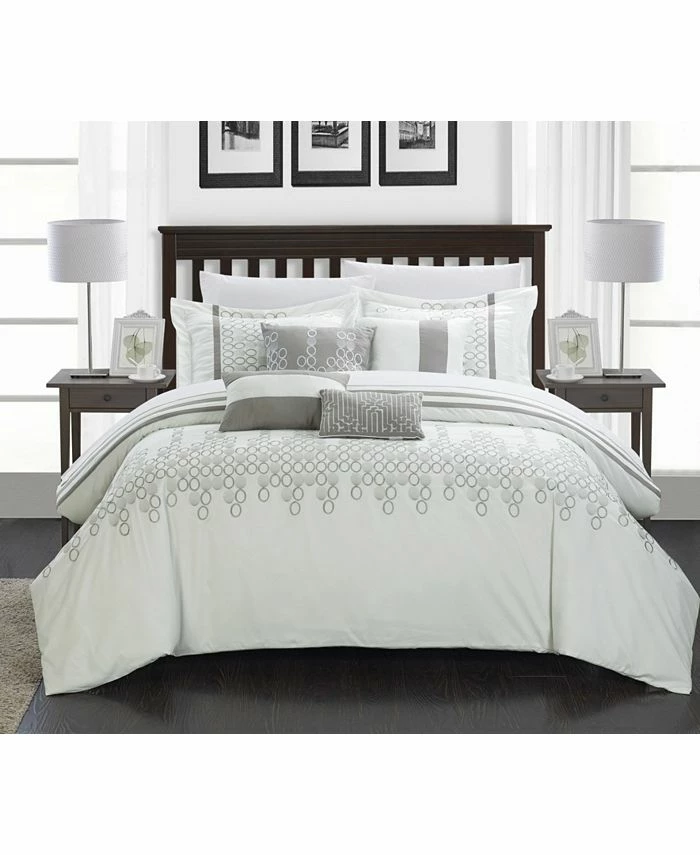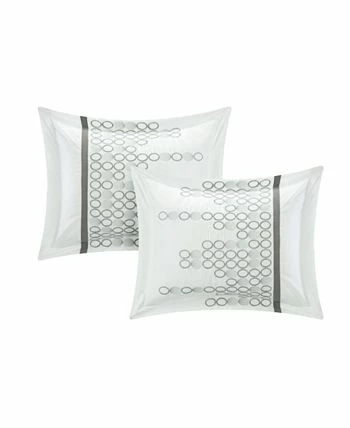 A fashion forward comforter set with everything you need for a complete bedroom décor makeover. Sophisticated and contemporary comforter featuring a geometric embroidery pattern. Sheet set, design coordinated shams and decorative pillows are included to complete the look.