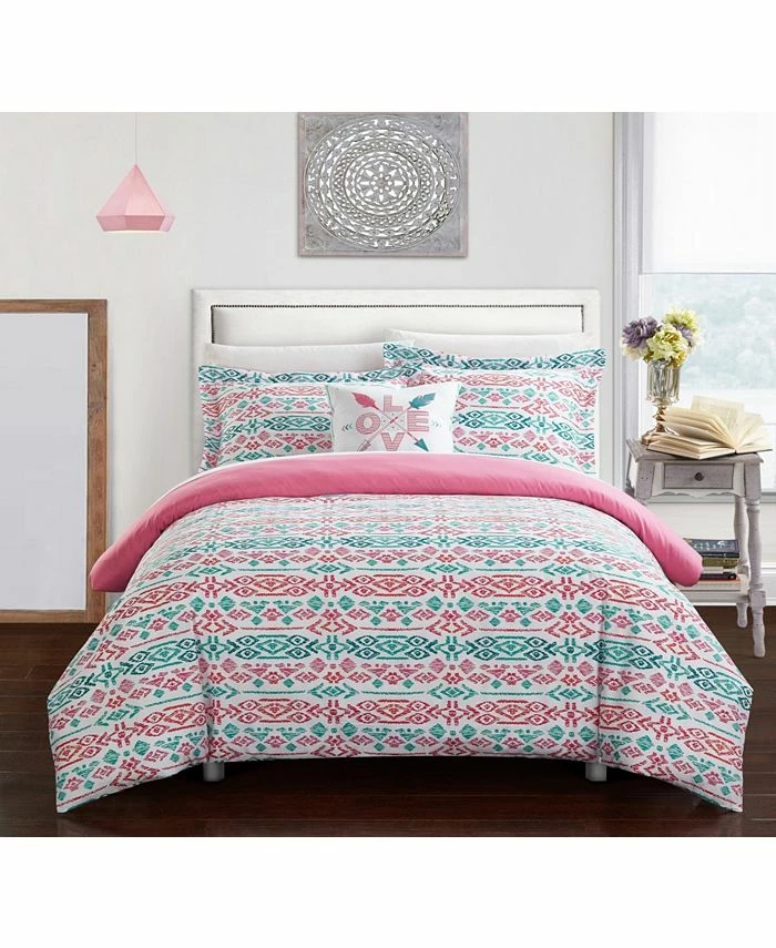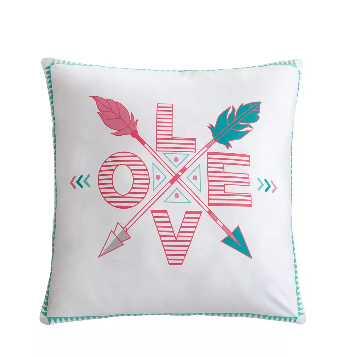 A designer inspired Bohemian bedding collection with everything you need for that perfect Boho chic look. Bright and fun colors in aqua and rose tones make this the perfect bedroom decor. Hip inspirational Boho pillows with “LOVE” message and embellished pom-poms are included to complete the look.