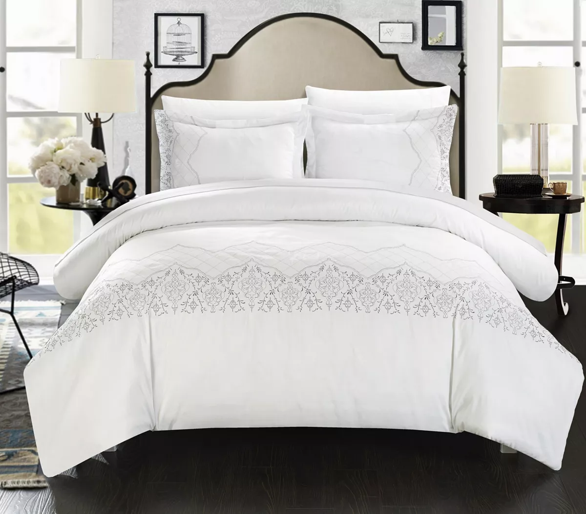 A fashion forward duvet cover featuring a bridal collection design with intricate embroidery. Design coordinated shams are included to complete the look. Zipper closure for easy use and care.