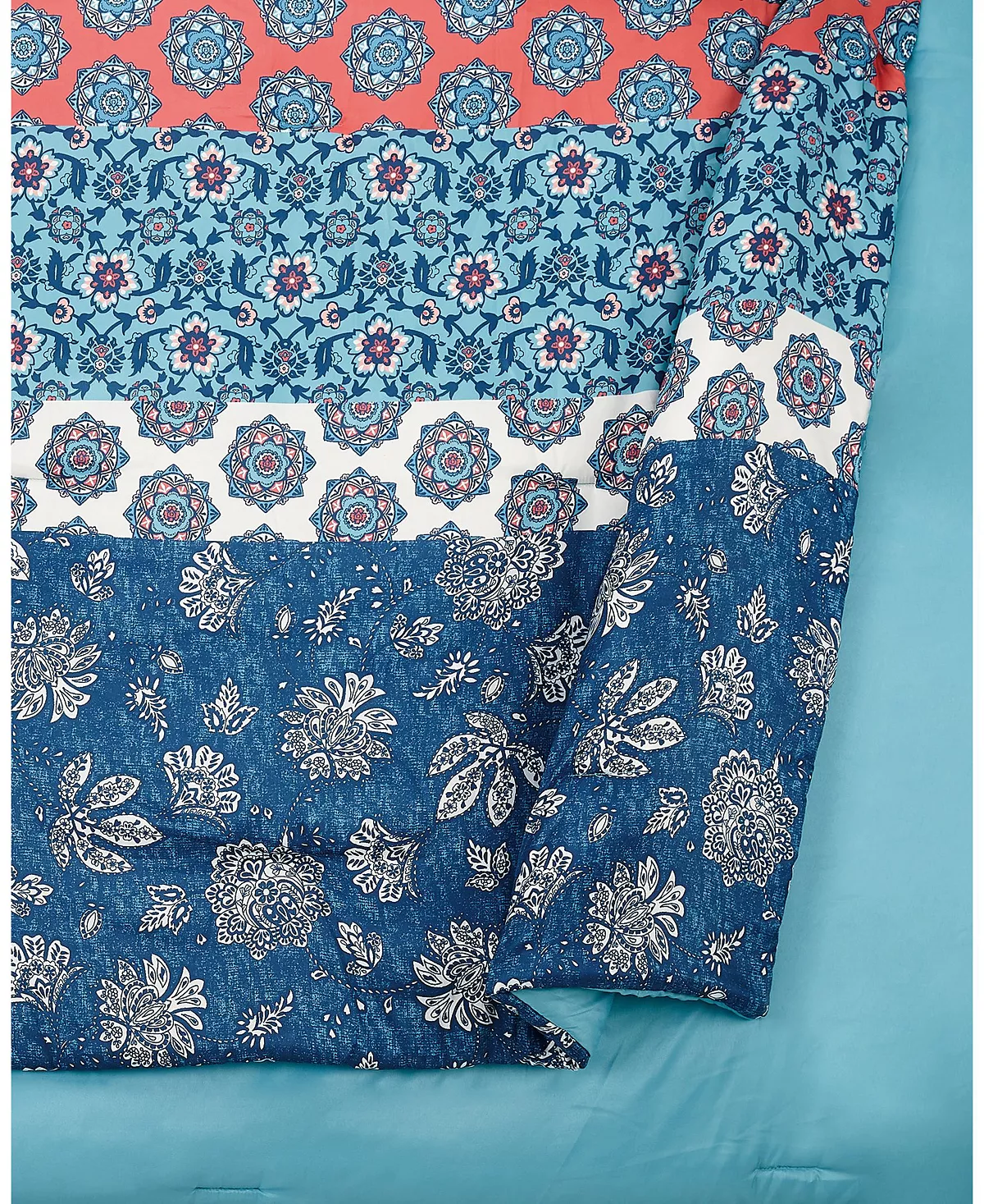 Lovely patchwork comforter inspired design with shades blue, aqua and coral in a distinct color palette reminiscent of refreshing water hues from the sea. The mix of medallion and Jacobean motifs with the look of hand printed fabric is both modern and timeless.