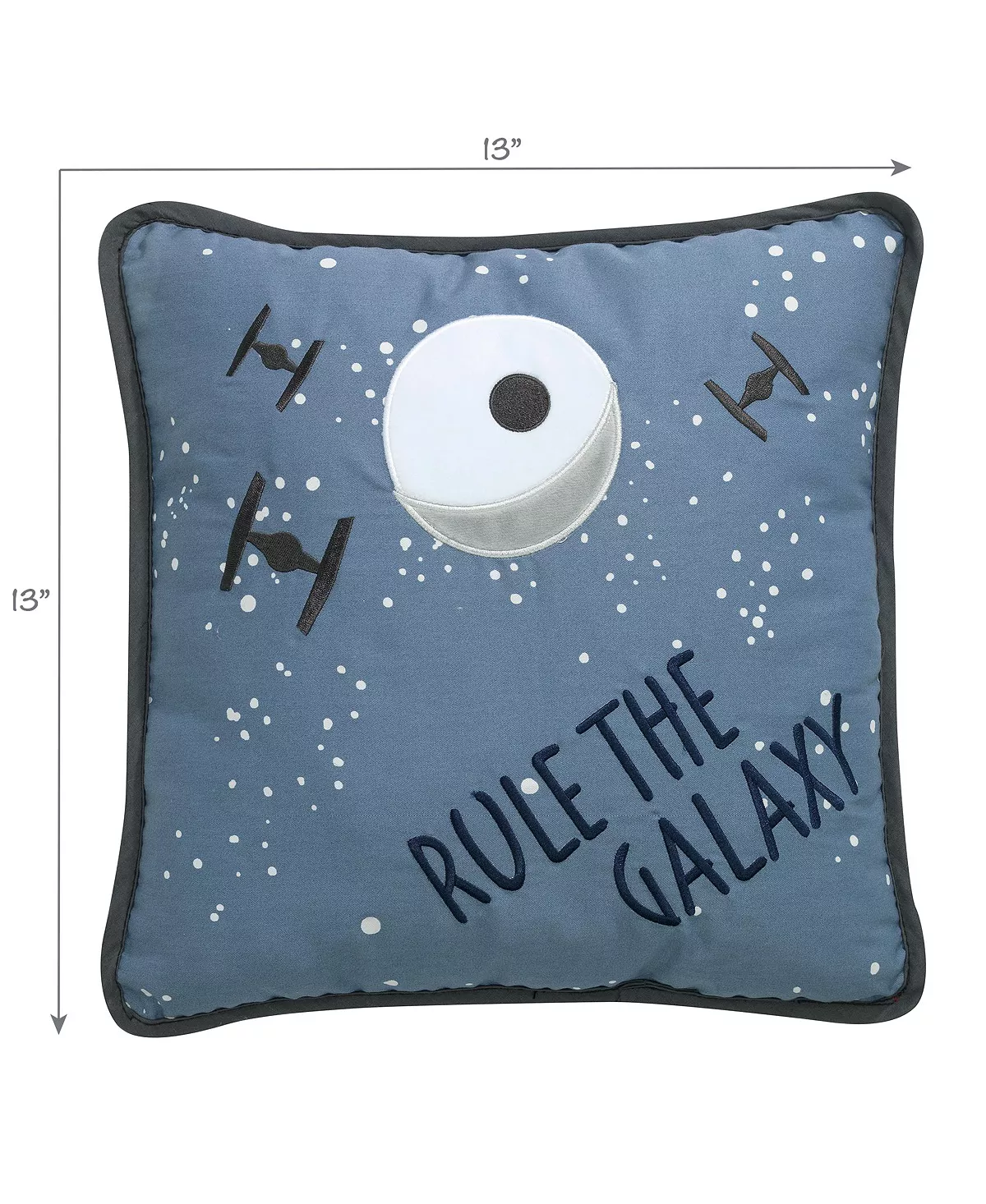 Light up the Star Wars Galaxy with this unique officially licensed iconic pillow. There are three embroidered tie fighter jets guarding the death star which is appliqued in gray and white velour. The eye is embroidered with black stitches.