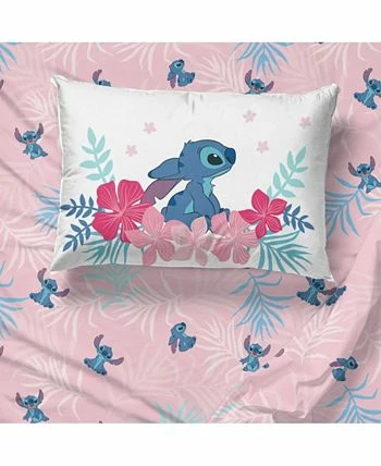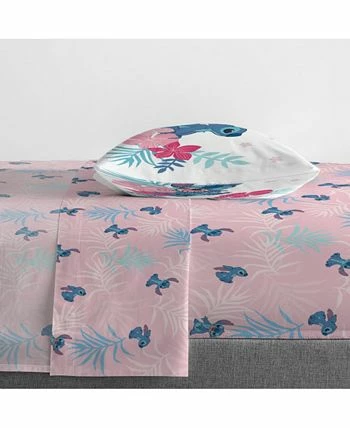 This Lilo Stitch paradise dream twin sheet set is the perfect addition to any bedroom. Set includes a fitted sheet, flat sheet, and pillowcase. The light pink sheet set is printed with an adorable stitch and colorful palms. Set is machine washable for easy care.