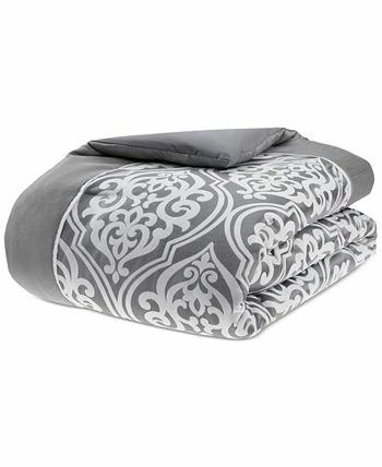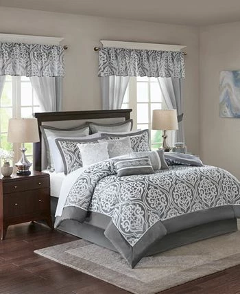 Revamp your bedroom with the Essentials Jordan room in a bag from Madison Park. The jacquard comforter creates a lavish look with its traditional ornate pattern and pieced design in rich hues of gray and white, while the coordinating shams reflect the motif seen on top of the bed. Four decorative pillows with embroidered details and a solid bedskirt provide the finishing touches to complete the collection. Also included are four solid window panels and two valances that allow you to create the perfect balance of style in your bedroom. Each window panel matches back to the bedding set and includes a tieback to give a clean and crisp finish to your decor.