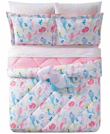 Create an enchanting atmosphere with the Kids Mermaids comforter set from Laura Hart, featuring mermaids, turtles, jellyfish, starfish and fish enjoying their aquatic habitat upon a calm white ground.