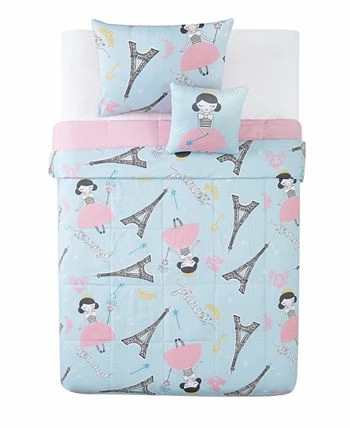 Images of the city of lights in pinks and teals and the little princess that rules the town is the theme for this bedding ensemble.