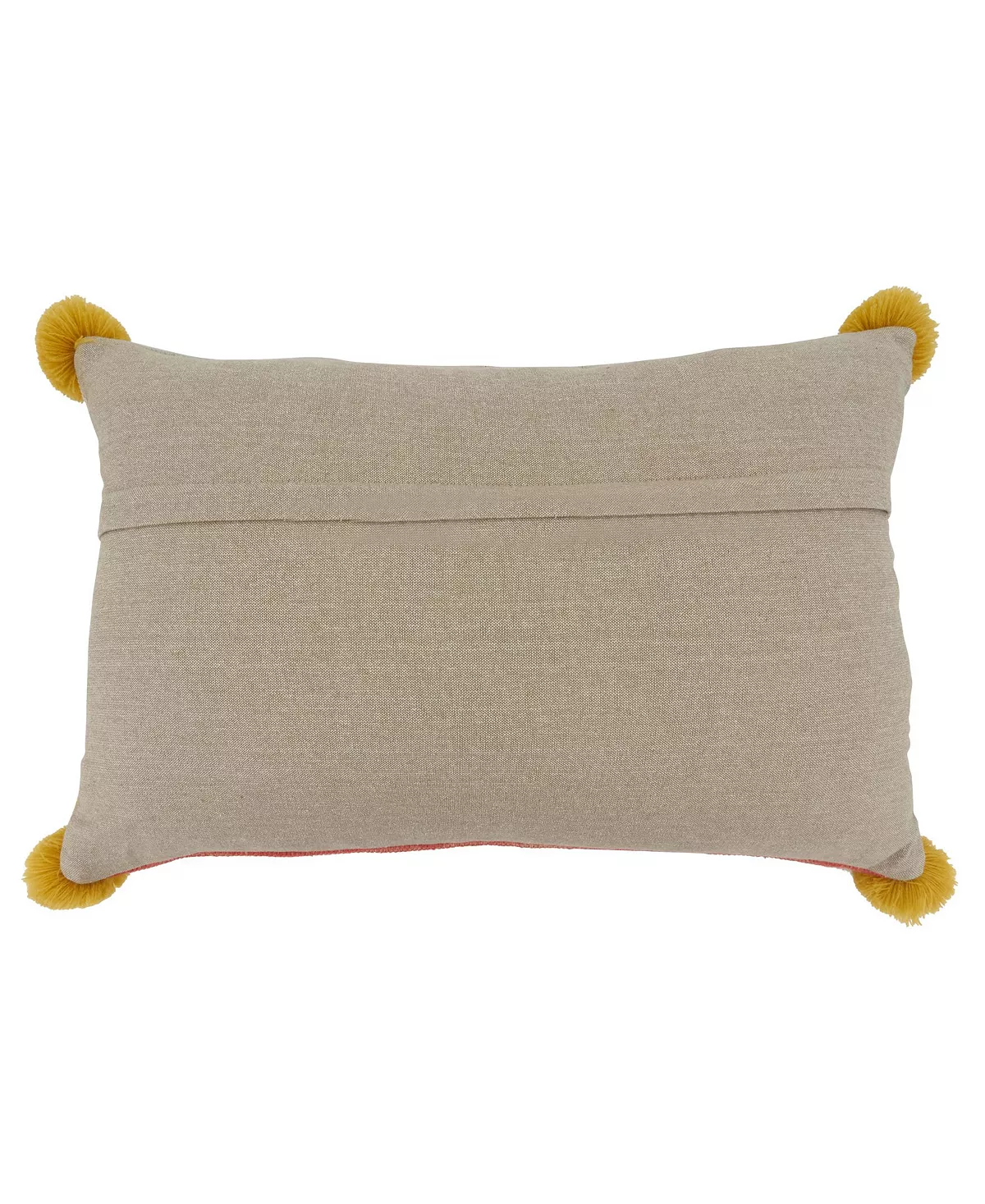 This pillow with geometric design is the perfect modern accent for your home. It features a variety of shapes and bold color that beautifully complement the fun pom pom detail. It delivers extra softness and comfort plus durability.