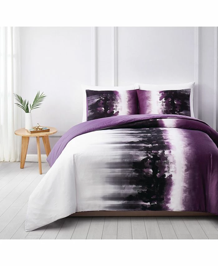 Striking abstract print with contrasting pure white and dusty purple solid colors are separated by a muddled bouquet stripe in this 100% cotton bedding pattern.